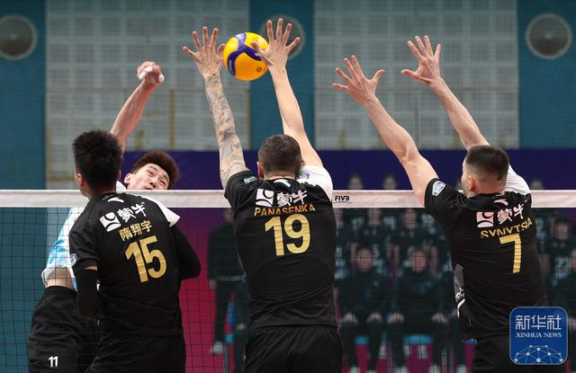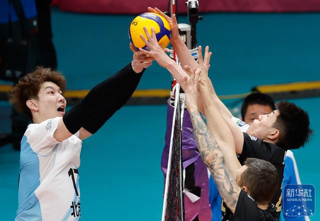 3月5日,在2025-2026赛季中国男子排球超级联赛季后赛C组比赛中,北京北汽队主场3比0战胜河北保定沃隶队。 ↑ 保定沃隶队球员辛尼察、康斯坦丁、杨宝淇(后排从左至右)在比赛中阻挡北京北汽队刘力宾的进攻。新华社记者 王丽莉 摄 ↑ 北京北汽队球员郭成、谷佳丰、刘力宾与邓忻朋(从右至左)在比赛中庆祝得分。新华社记者 王丽莉 摄 ↑ 北京北汽队球员邓忻朋(左...